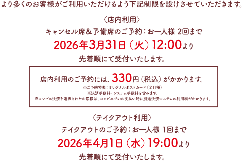 ・お席のご予約には、ご予約料として330円(税込)がかかりますのでご了承ください。