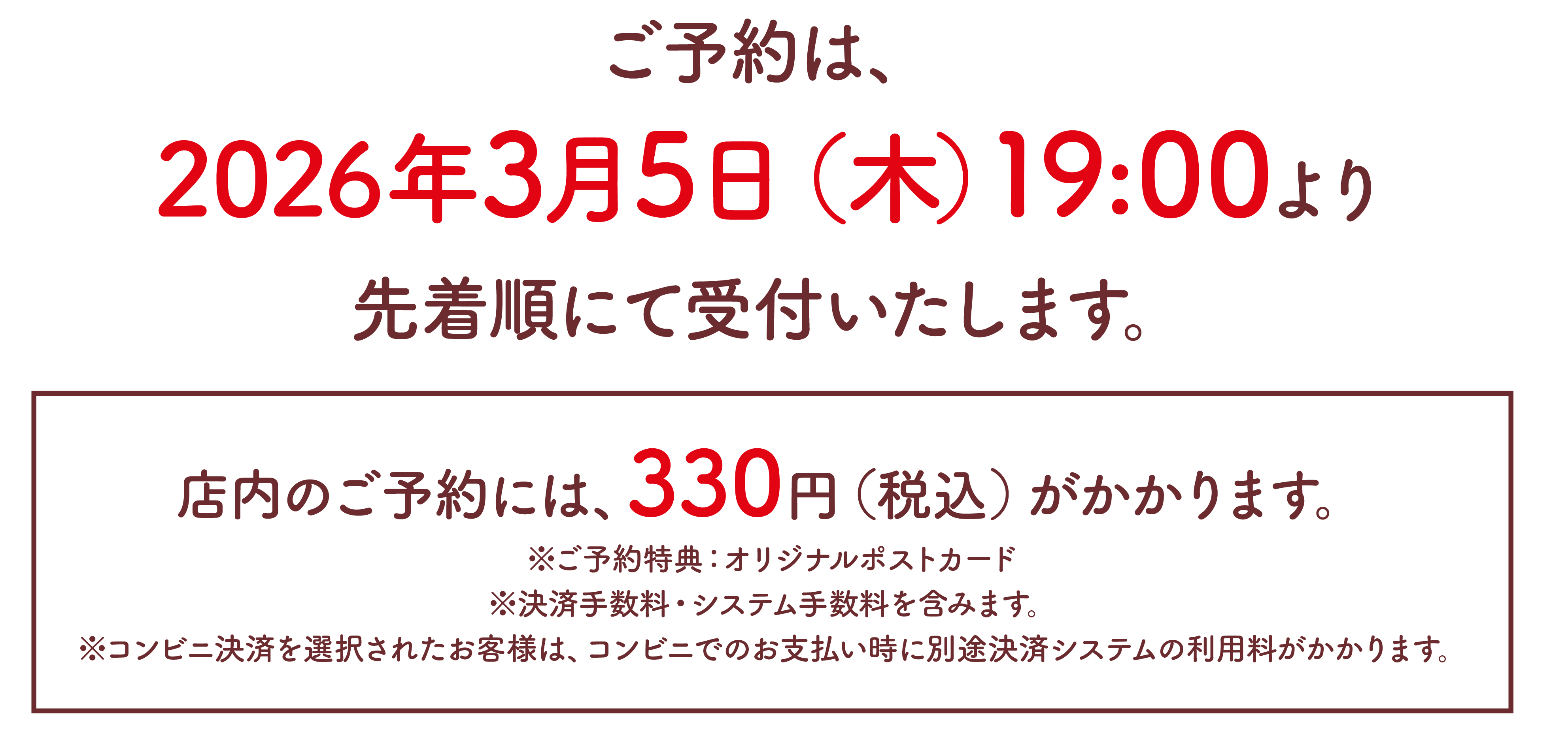 ・お席のご予約には、ご予約料として330円(税込)がかかりますのでご了承ください。