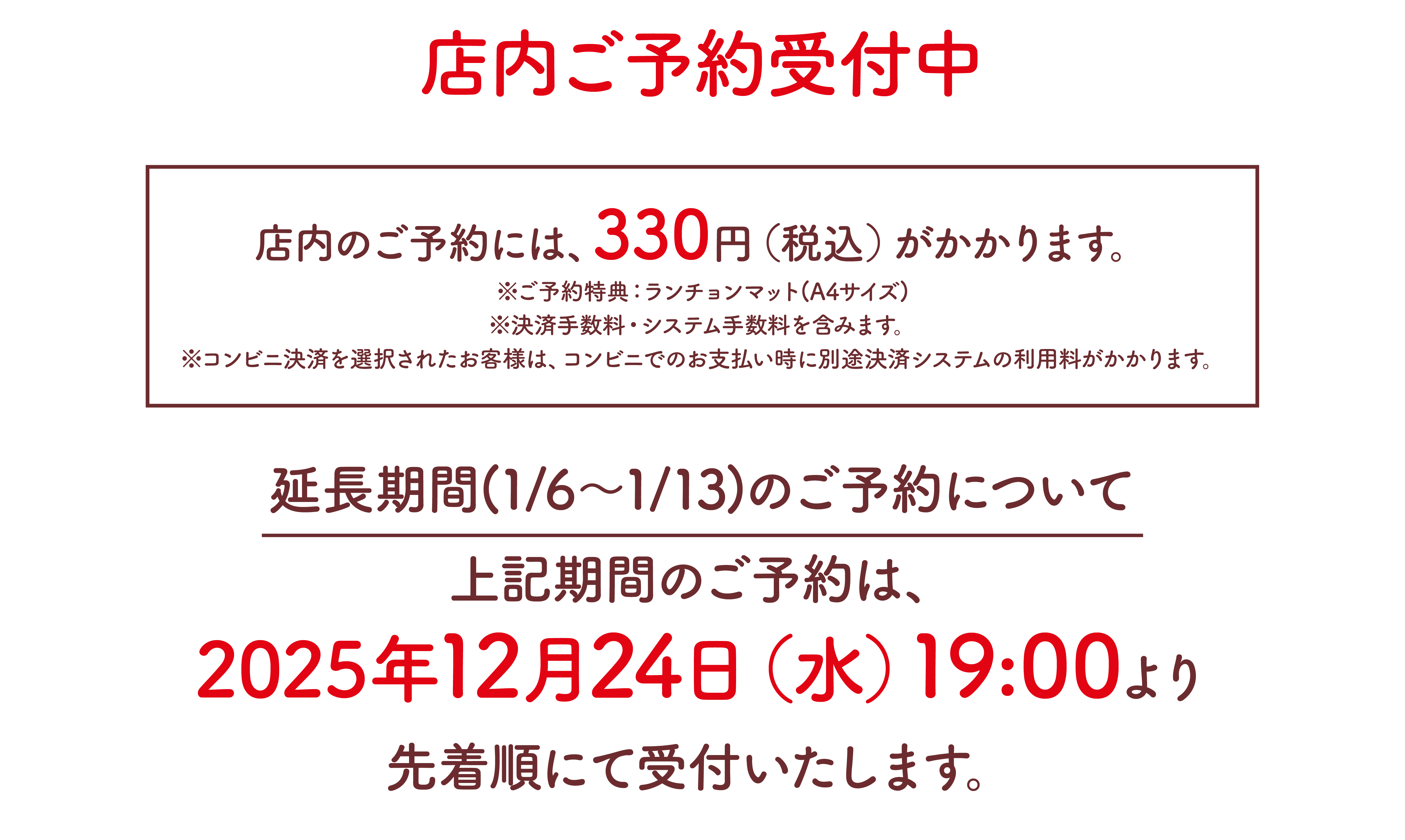 ・お席のご予約には、ご予約料として330円(税込)がかかりますのでご了承ください。